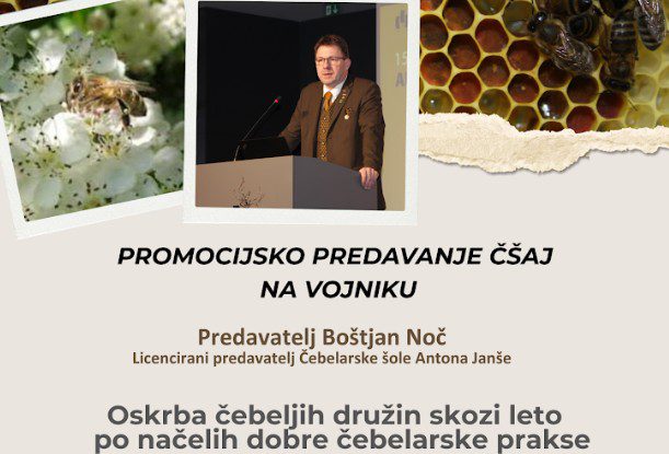 Oskrba čebeljih družin skozi leto po načelih dobre čebelarske prakse Pod tem naslovom je potekalo predavanje licenciranega predavatelja Čebelarske šole Antona Janše, Boštjana Noča, predsednika Čebelarske zveze Slovenije ter predsednika Evropske čebelarske zveze. Predavanje je