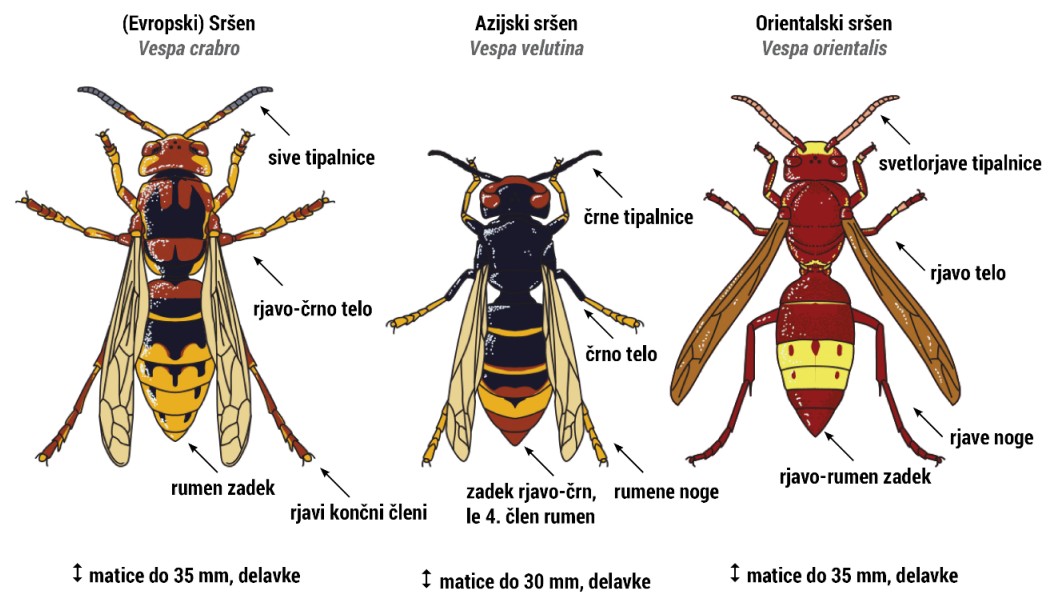 Primerjava znakov domorodnega evropskega sršena (Vespa crabro), azijskega sršena (Vespa velutina nigrotorax) in
